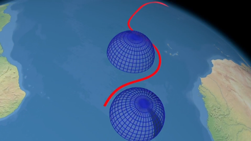 Screenshot from Vladimir Putin's 2018 presentation unveiling the Burevestnik, illustrating its ability to evade maritime missile defenses.