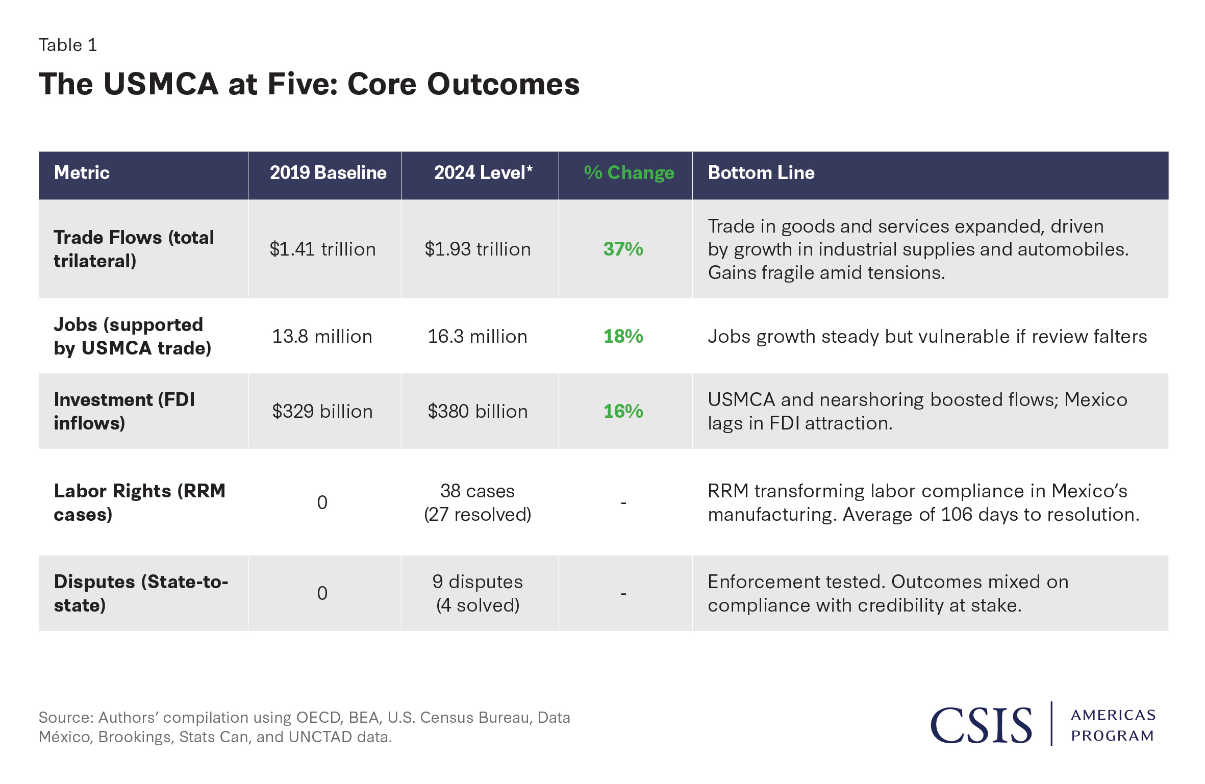 - In its first five years, four state-to-state disputes advanced through panel proceedings with final rulings issued. This reflects a stronger commitment to enforceable rules. However, the United States has yet to comply with the automotive rules of origin ruling, and cases involving Mexico’s energy policy remain in consultations. These examples illustrate how political calculations continue to outweigh investor certainty.