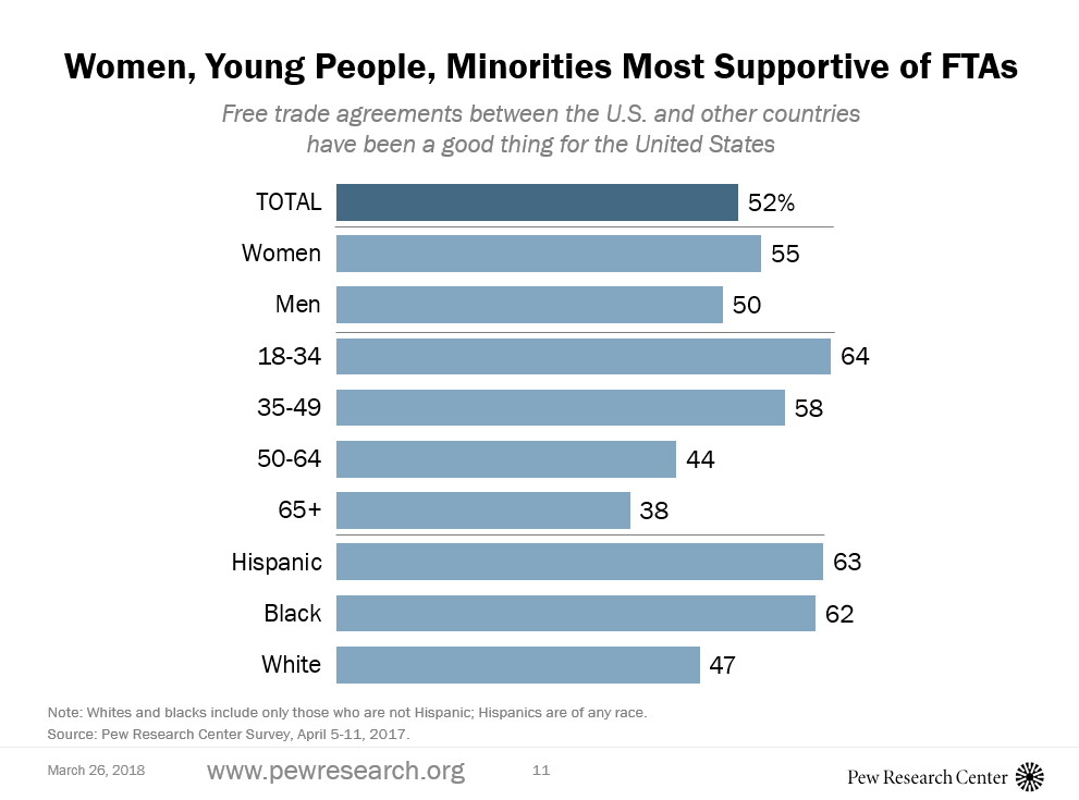 As always, demography rules. The parts of our population that support trade agreements—young people and minorities—are heavily represented in the Democratic Party; the Republican Party not so much. Why, then, have we not seen our politicians moving in the direction of their voters? One would think that self-preservation would be a powerful motive. The answer lies in yet another Pew chart:
