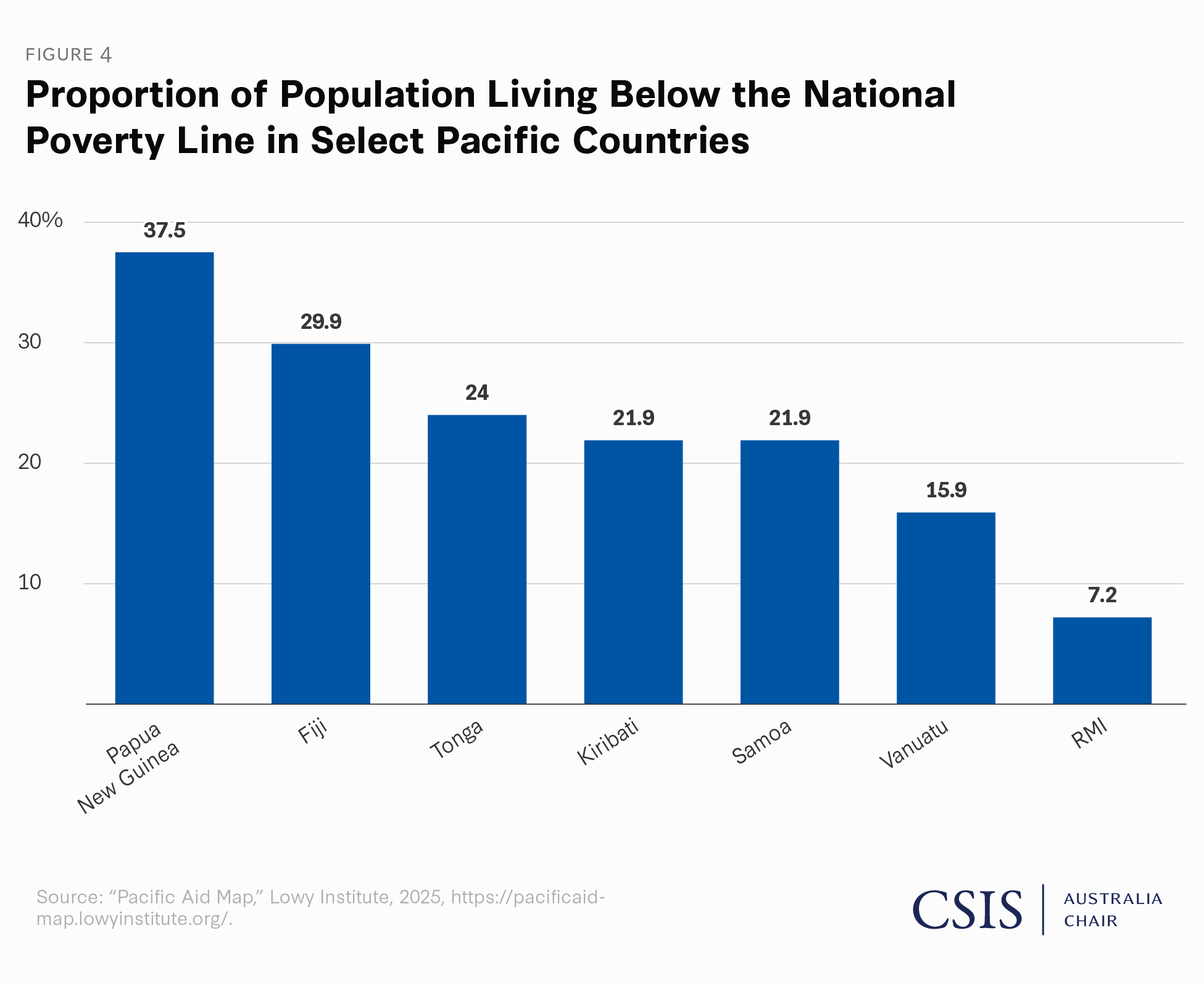 While halting the majority of USAID and State Department foreign assistance programs will no doubt have a larger tangible effect on the everyday lives of Pacific Islanders, the “Liberation Day” tariff announcements also caused shock and confusion in a region that has long looked to the United States as global economic leader with which countries sought closer trade ties. The high rates on these small and often struggling economies—where in some islands over 25 percent of the population lives below the poverty line (see Figure 4)—appeared disconnected with both reality and common sense. The United States has a trade surplus with all but two of the Pacific Islands—Fiji ($208 million trade deficit) and Tuvalu ($168,000 trade deficit), the latter of which has a population of around 11,000—and yet almost none escaped liberation day unscathed.