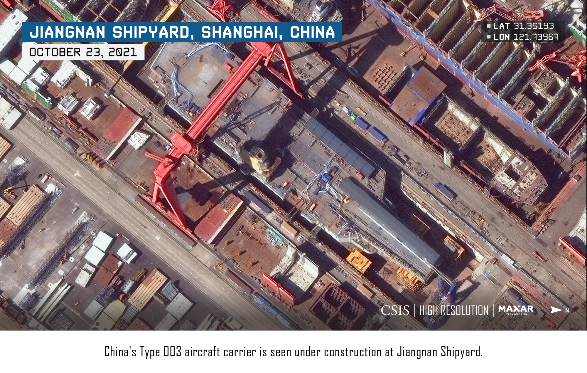 Steady progress on the construction of China’s third aircraft carrier has continued throughout 2021, and the vessel—commonly known as the Type 003—may launch in the coming months. Commercial satellite imagery of Jiangnan Shipyard captured on October 23, 2021, reveals that the installation of the carrier’s main external components is nearing completion. Work on other military vessels at Jiangnan appears to have slowed as the shipyard works to fill commercial orders.