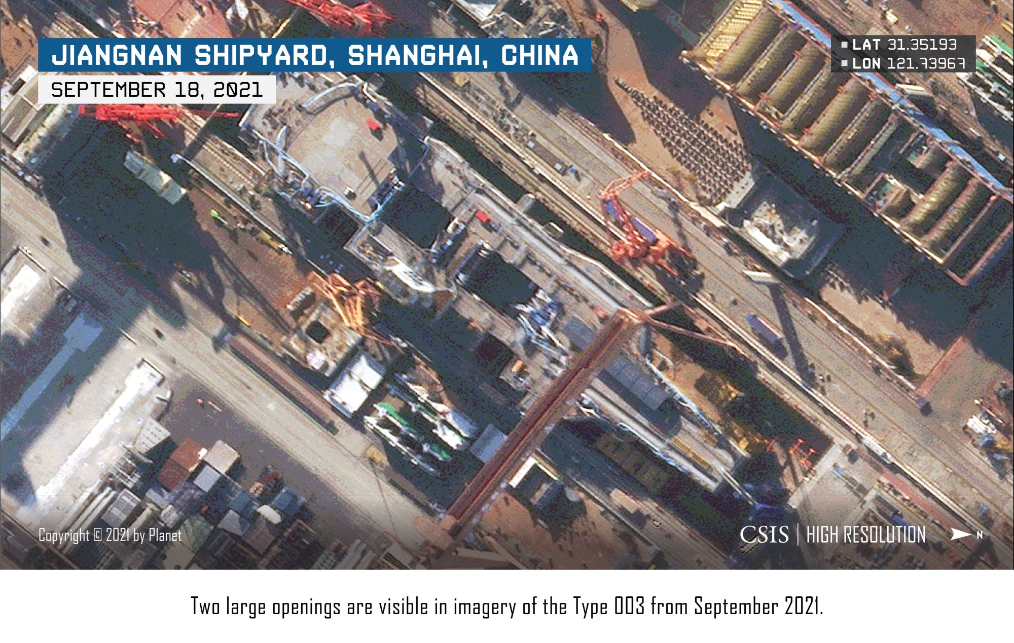 This blurring of commercial and military activity is a hallmark of many Chinese shipyards, and the construction history of the Type 003 is a prime example. The carrier currently shares a dry dock with the hull blocks of an unidentified container ship. Before the Type 003 was moved to its current location, a French-owned container ship was being built at the same spot. At the Type 003’s previous build site—an area of the shipyard that appeared custom made for constructing large naval vessels—work on another commercial vessel (likely a liquified natural gas carrier) is now underway.