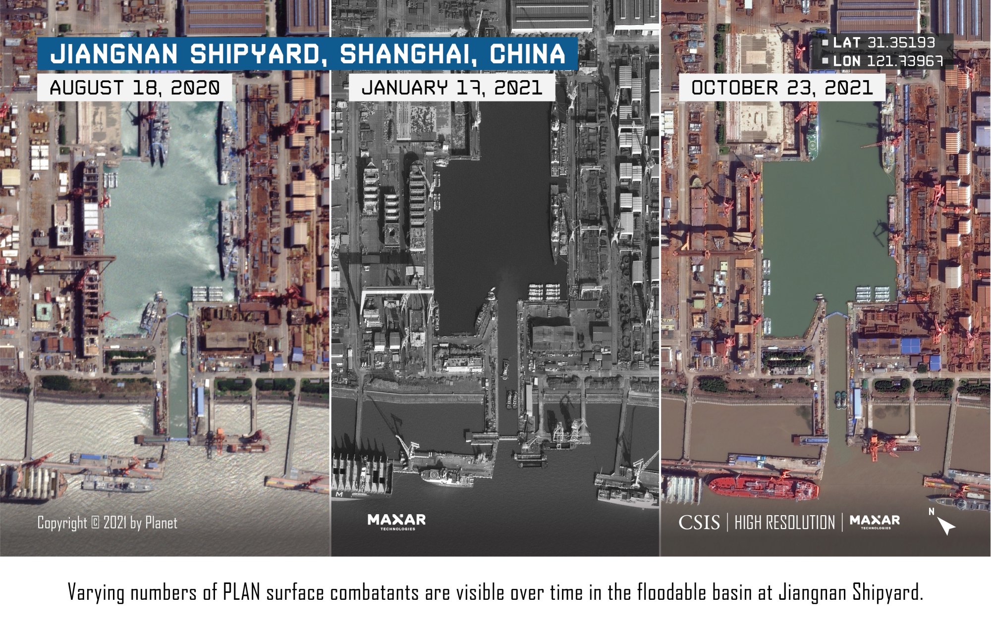 While the carrier remains at the forefront of operations at Jiangnan, recent months have seen a significant slowdown in the construction of other military vessels. Satellite imagery of the shipyard from October 23 shows that other surface combatants at Jiangnan are few and far between. This sharply contrasts with previously observed activity, which revealed a flurry of military vessels under construction or being fitted out. There has been no corresponding slowdown in the production of merchant ships. Instead, many of the dual-use facilities at Jiangnan appear to be, at least for now, focused on commercial builds.