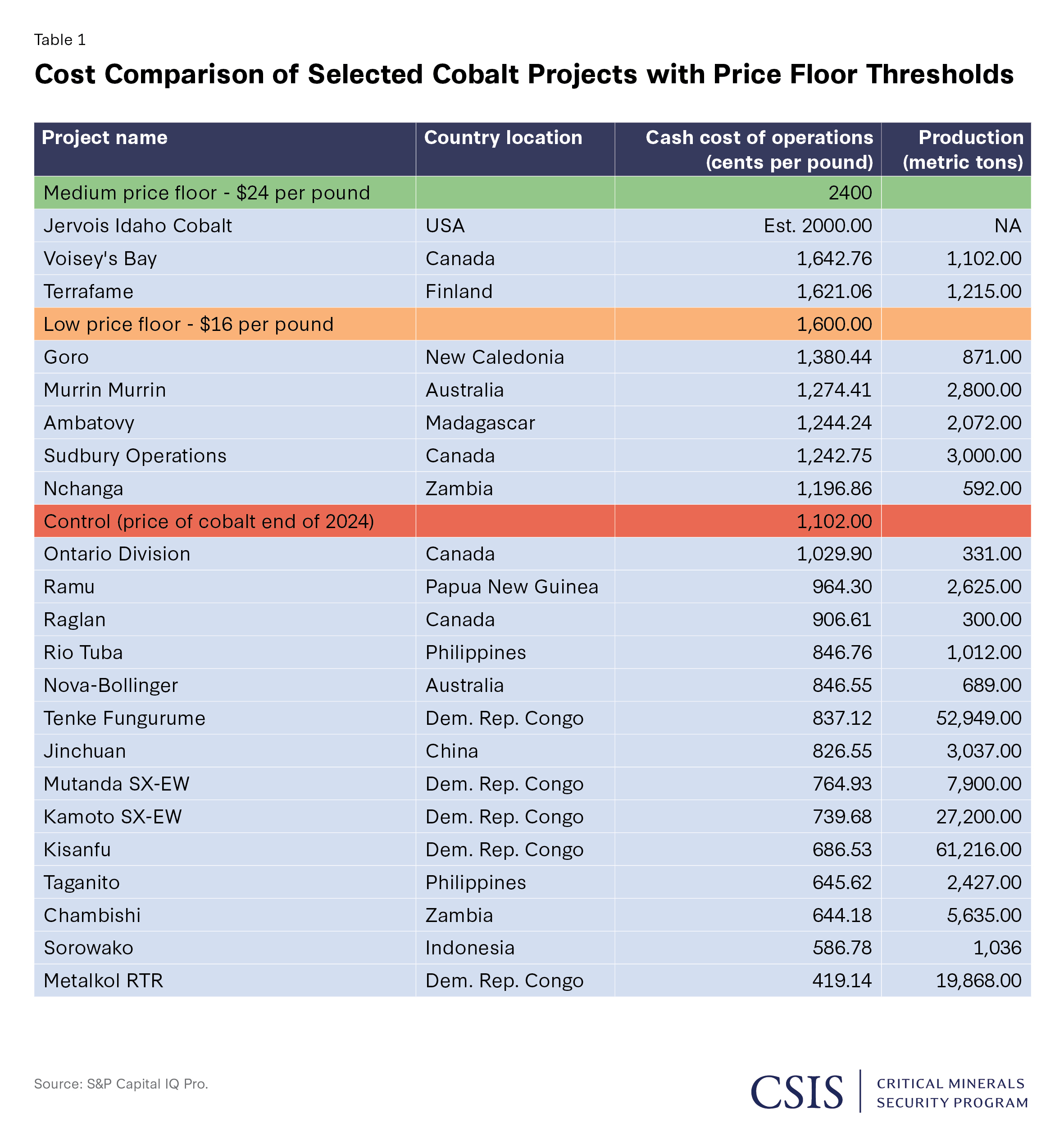Without a price floor, there is no additional cash cost to the U.S. government, but significant strategic costs. Under current market conditions, large-scale cobalt projects operating in the West are extremely vulnerable to price volatility, and periods of low prices threaten the economic viability of these projects. As seen in Table 1, no large-scale cobalt projects producing more than 1,000 metric tons of cobalt per year operate profitably given higher operational costs and low cobalt prices. In light of these market conditions, there are no incentives for Western industry to build alternative cobalt mining and refining capabilities, leaving key defense and commercial industries reliant on Chinese cobalt sourced primarily from the DRC.