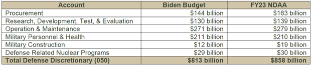 1Source: House Armed Services Committee, FY23 National Defense Authorization Act, December 5, 2022, https://republicansarmedservices.house.gov/sites/republicans.armedservices.house.gov/files/Final%20FY23%20NDAA%20Conf%20Highlights.pdf.
