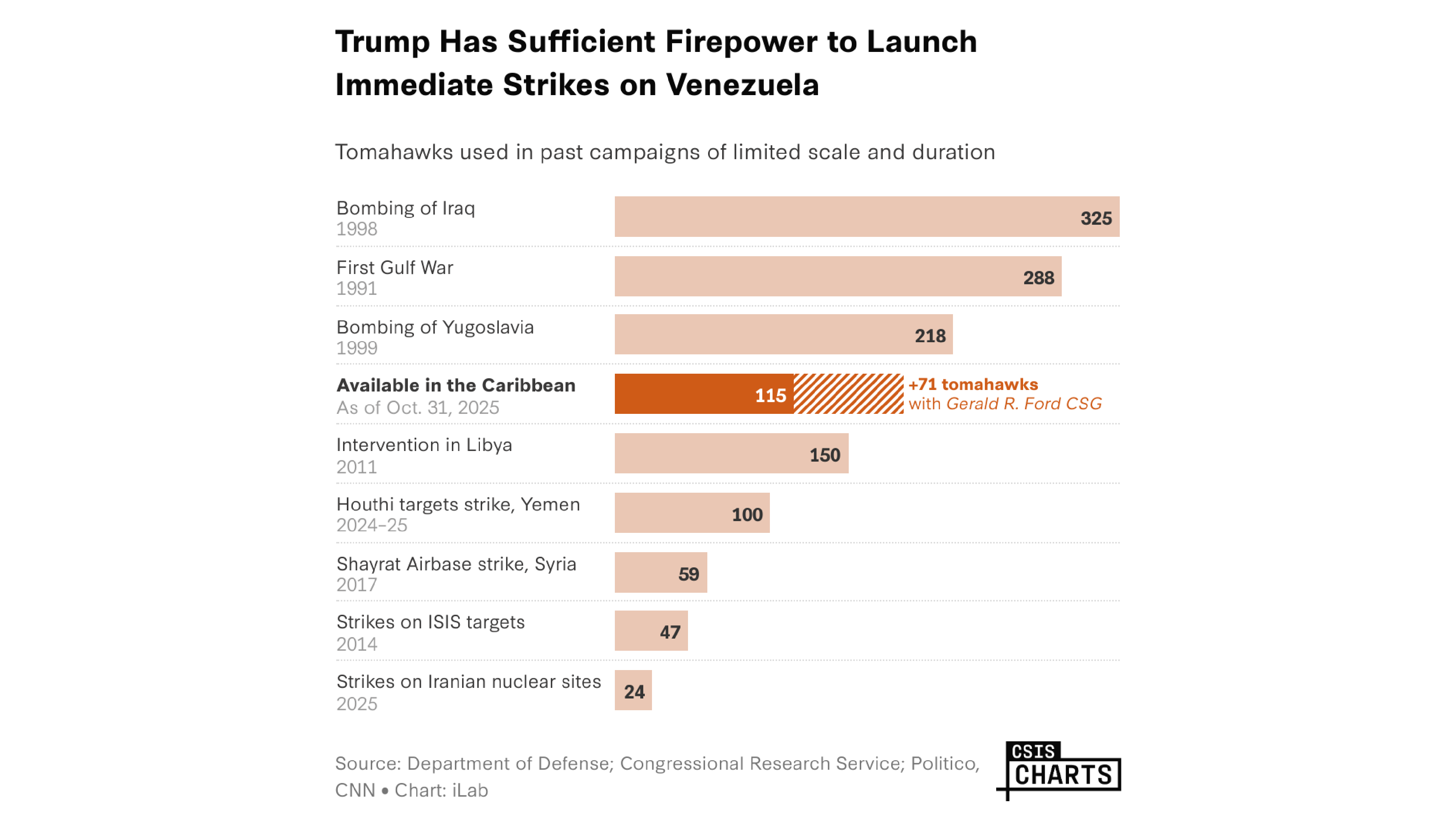 - The number of available Tomahawk missiles in the Caribbean are at levels comparable to those used in previous campaigns of limited scale and duration. U.S. ships in the Caribbean today carry an estimated 115 Tomahawks. The arrival of three destroyers escorting the USS Gerald R. Ford aircraft carrier will add around 70. These missiles could strike drug cartel facilities or Maduro regime targets.
