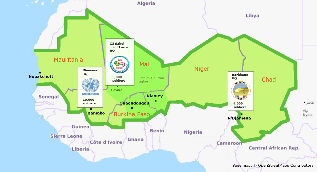 - Multiple bilateral training missions: several entities are engaged in military training in the region, including the European Union, which conducts two training missions in Mali—the EU Training Mission in Mali (EUTM) and the EU Capacity-Building Mission (EUCAP), also present in Niger. The United States established Operation Enduring Freedom–Trans Sahara (OEF-TS) in 2007, primarily a training mission to equip regional militaries to combat insurgents. The U.S. footprint has expanded dramatically recent years, with U.S.-operated drone bases in Niger and Burkina Faso and some 1,000 U.S. forces deployed. Training exercises are one component of the broader U.S. Trans Sahara Counterterrorism Partnership (TSCTP), which includes nonmilitary assistance to improve governance, strengthen social cohesion, and dampen the allure of militancy and extremism. The United States, along with France, is also engaged in the fight against Boko Haram in the Lake Chad Basin region, which affects some, but not all, of the G5 states and has required a further deployment of resources and personnel.