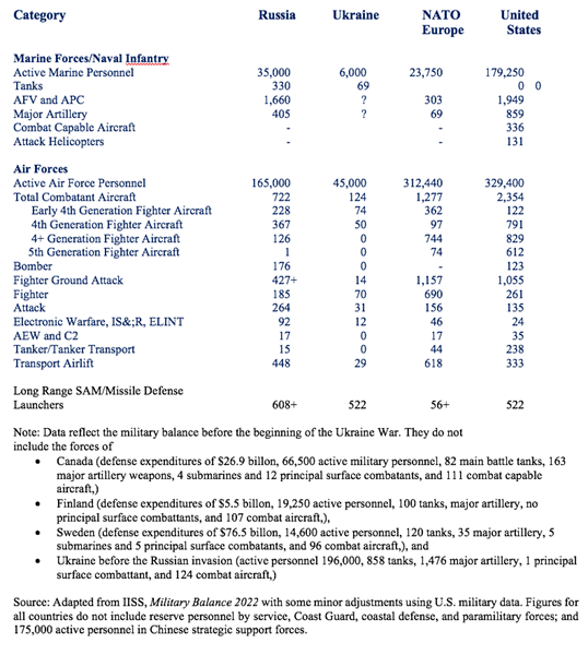 Comparisons of Russian and Western GDPs are equally uncertain, but some estimates of the total GDP of NATO were at least $32 trillion at the end of 2021, or some 45% of the global economy or more than 18 times that of Russia. Some estimates go as high as $37 billion, or 21 times the size of Russia. Providing aid to Ukraine effectively has forced Russia to fight a proxy war in which both the U.S. and Europe could exploit the fact they have a massive strategic advantage in both defense spending and total economic resources. 10