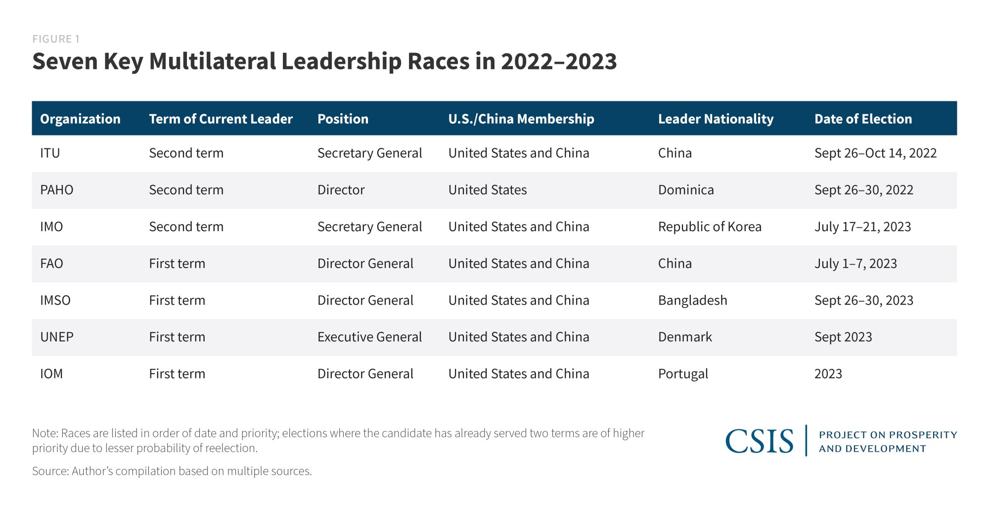 Over the next two years, several leadership positions in multilateral organizations will be up for election, warranting the attention of the United States. A necessity for maintaining global peace and security, these multilateral institutions serve as channels to project U.S. soft power and promote U.S. interests. While these organizations have diverse levels of notoriety, ranging from the relatively unknown International Maritime Organization (IMO) and International Mobile Satellite Organization (IMSO) to the more ubiquitous World Bank and Interpol, securing leadership positions within these organizations remains critical for the United States and its like-minded allies to achieve their foreign policy goals. Leaders set the directions and agendas of these organizations and have significant decisionmaking power, particularly over institutional priorities, budget allocations, and staff composition. Supporting U.S. or U.S.-friendly candidates to lead influential multilateral organizations can help advance policy decisions that are in the interests of a world order the United States supports.