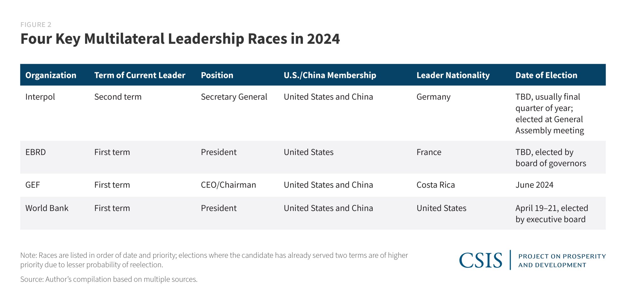 The other eight relevant races are the Food and Agriculture Organization (FAO), International Mobile Satellite Organization (IMSO), UN Environment Programme (UNEP), International Organization for Migration (IOM), International Criminal Police Organization (Interpol), European Bank for Reconstruction and Development (EBRD), Global Environment Facility (GEF), and World Bank. Given the norm of successful reelection for leaders of these organizations, the Biden administration would be wise to focus on elections where leaders have already served two terms and, among these, target institutions that hold great strategic interest to the United States.