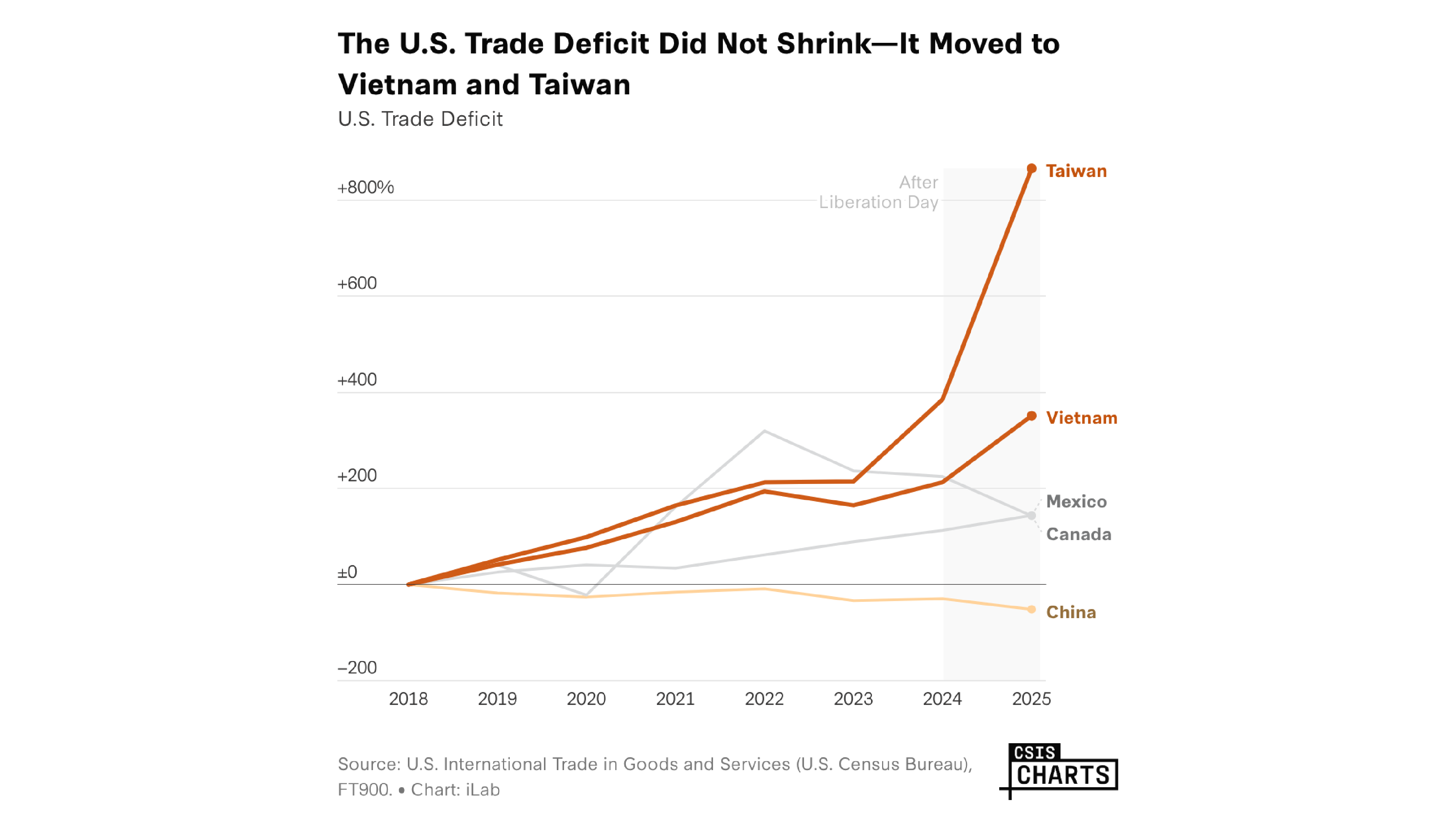 One year after Liberation Day, the U.S.-China trade war has reshaped the geography of U.S. trade deficits without reducing their scale. Vietnam is now close to posting a larger bilateral goods deficit with the United States than Mexico.