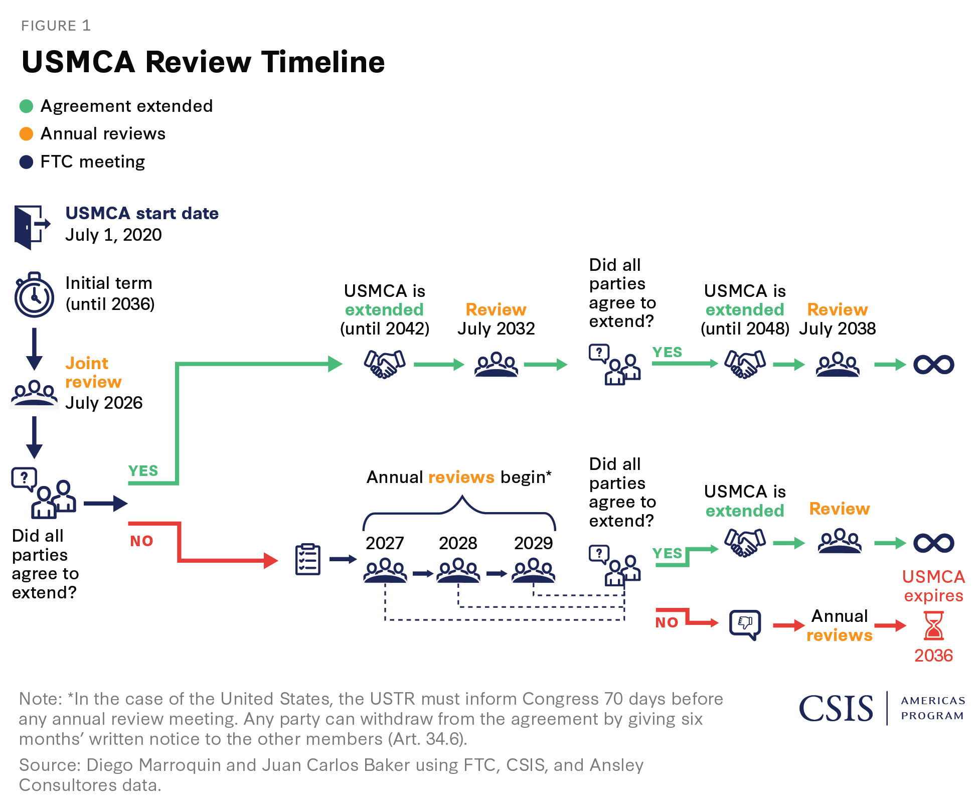 Under Article 34.7 of the USMCA, the three governments must decide by July 1, 2026, whether to extend the agreement for another 16 years. If any party declines to confirm, the USMCA enters a cycle of annual reviews and, absent resolution, expires in 2036. July 1 is therefore not a deadline for completing negotiations. It is the point at which the clock either resets or starts running down. If the clock resets and the USMCA is renewed, with or without amendments, the same process will recur in 2032. The following diagram traces the key phases and decision points of this process.