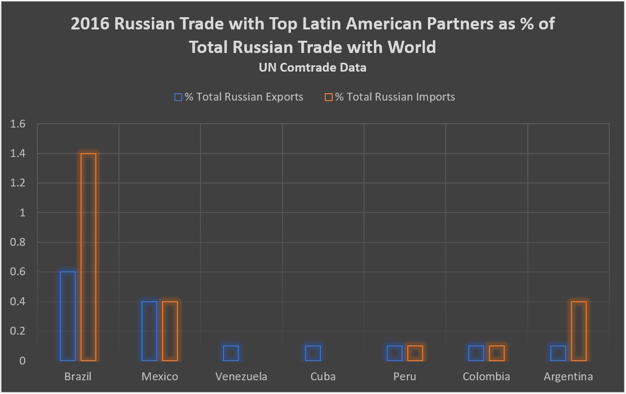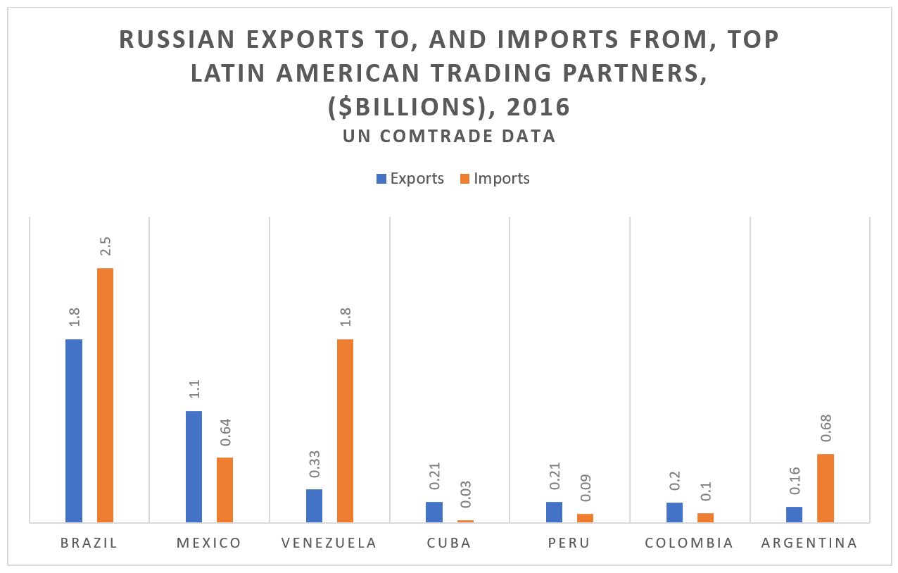 Russian trade in goods with Latin America is small, representing less than 2 percent of its entire trade with the world. Its biggest trading partner is Brazil, with total bilateral trade of just over $4 billion in 2016. It purchased about $1.7 billion of oil from Venezuela in 2016, but otherwise trade flows with other major Latin American companies are relatively tiny. Russia’s annual total trade in 2016 with Mexico was equal to the amount Mexico trades with the United States every 36 hours.