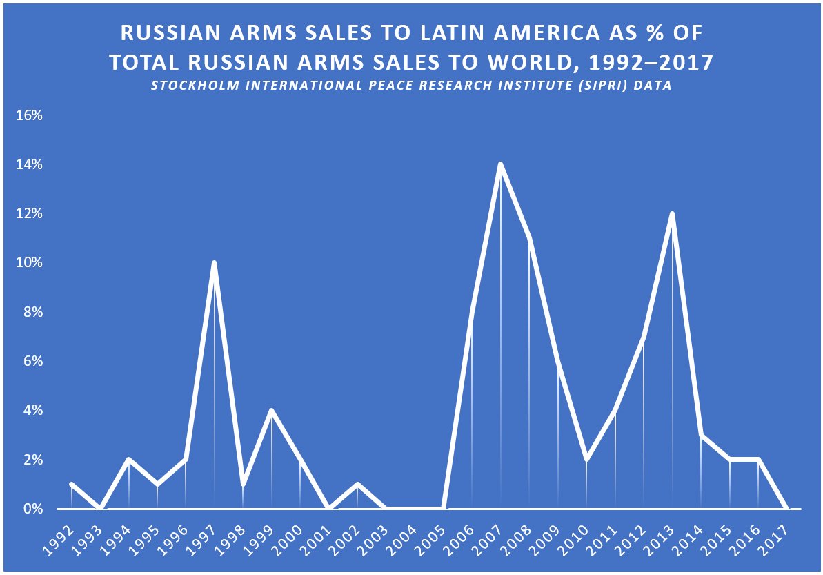 A subset of Russia’s trade with Latin America is the sale of weapons. The vast majority, 73 percent, has gone to Venezuela. Between 1992 and 2017, arms sales to Latin America represented 4 percent of Russia’s arms sales to the world. There were, however, distinct spikes in 2007 (which included the sale of 100 combat aircraft to Venezuela) and 2013 (including 123 armored personnel carriers and surface-to-air missiles to Venezuela). Other recipients have included Mexico (60 transport helicopters over 25 years) and Peru (transport helicopters, aircrafts, and spare parts for MiG-29 fighters acquired from Belarus). With the rise of center-right governments in Brazil, Argentina, and Chile, arms deals with these countries fell apart. Sales to the region have fallen from $928 million in 2013 to zero in 2017.