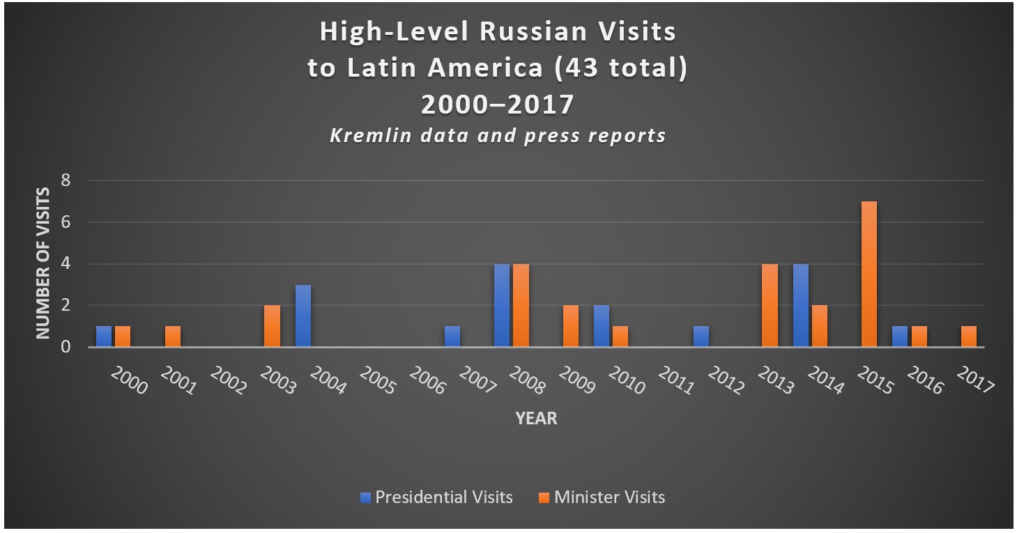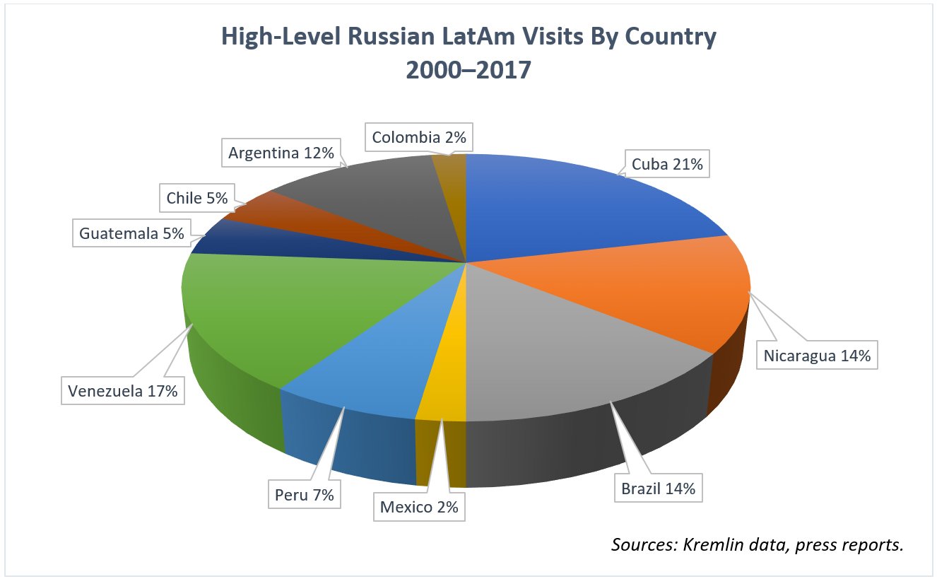 Russia’s diplomatic engagement with the region appears to be relatively more important than commercial or military interests. With 16 presidential visits and 26 ministerial-level visits since 2000 (over 2 high-level visits a year), the Latin American countries may be getting more attention than they deserve, given the paucity of Russia’s classic strategic interests in the area. Which nations get the most attention? Three countries—Cuba, Venezuela, and Nicaragua—have accounted for over half of Russia’s 43 high-level visits since 2000. Mexico has received only 2 visits, by Vladimir Putin in 2004 and 2012.