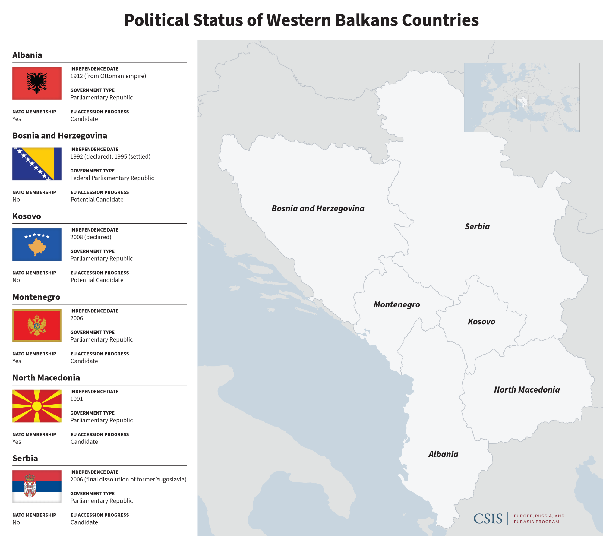 As with Ukraine, Russia sees the Western Balkans as a buffer zone where it can preserve a sphere of influence and undermine the West. In Montenegro, Russian FSB and GRU operatives were among those arrested for a failed coup attempt in 2016 designed to stop Montenegro’s accession to NATO. Regarding to Kosovo and Serbia, Russia’s support for Serbia’s position undermines attempts to normalize relations between the two countries, thus hindering their respective integration into the European Union. And in Bosnia, Russia’s recent threats to veto the renewal of the EU peacekeeping force in Bosnia have underlined the fragility of Bosnia’s post-war constitution. In all these cases, Russia has demonstrated that it could easily destabilize the Balkans.