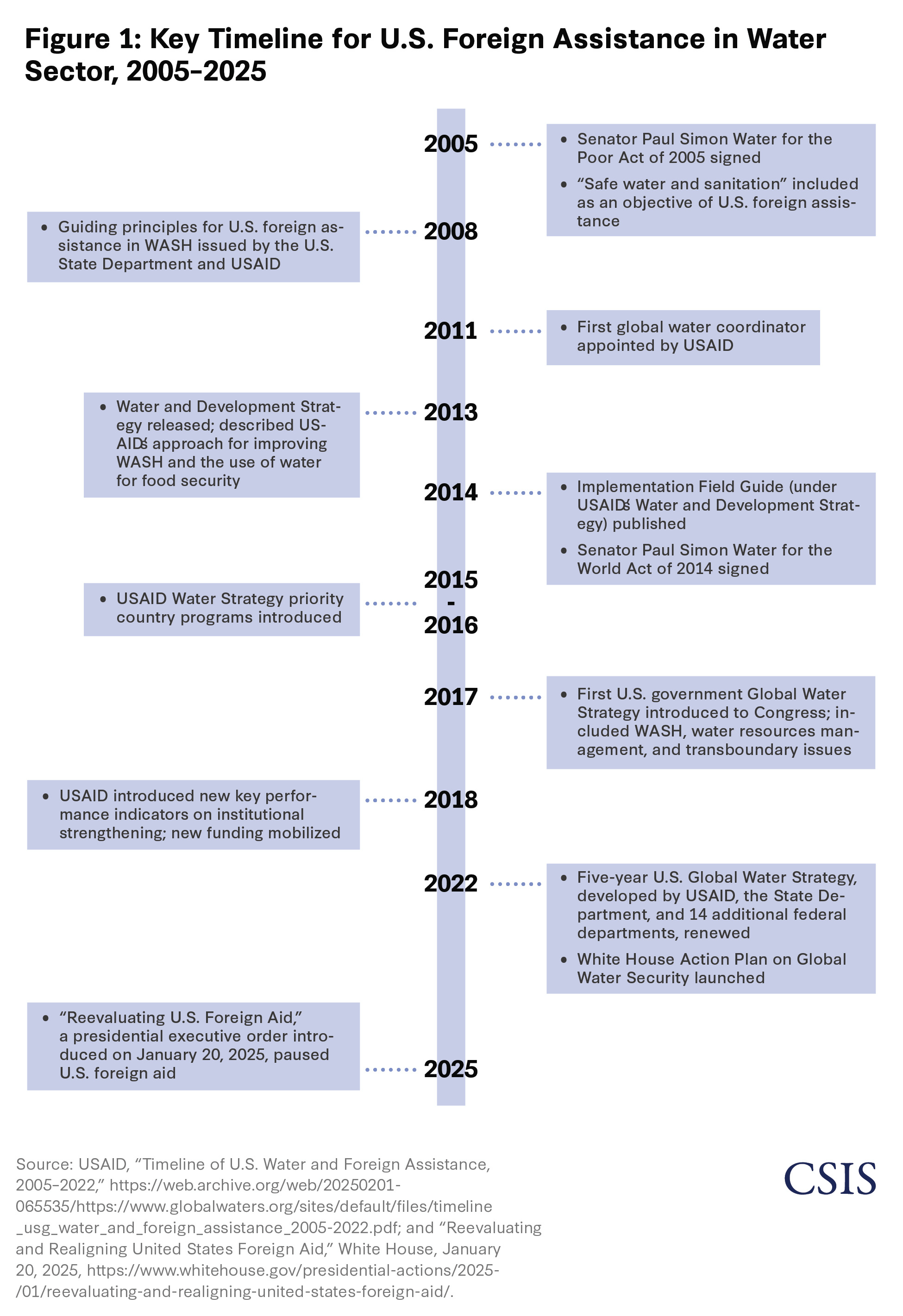With passage of the Senator Paul Simon Water for the Poor Act in 2005, Congress made increasing developing country access to safe water, sanitation, and hygiene (WASH) an explicit goal of U.S. foreign assistance. Importantly, the act not only framed strengthening water services as public health and development imperatives but cast water scarcity as a prospective conflict risk. Competition over vital shared water resources, it argued, could potentially threaten national security and international stability. This landmark legislation required the president, acting through the Department of State and USAID, to formulate a strategy for advancing safe water and sanitation provision in developing countries and to designate specific “High-Priority” countries for assistance.