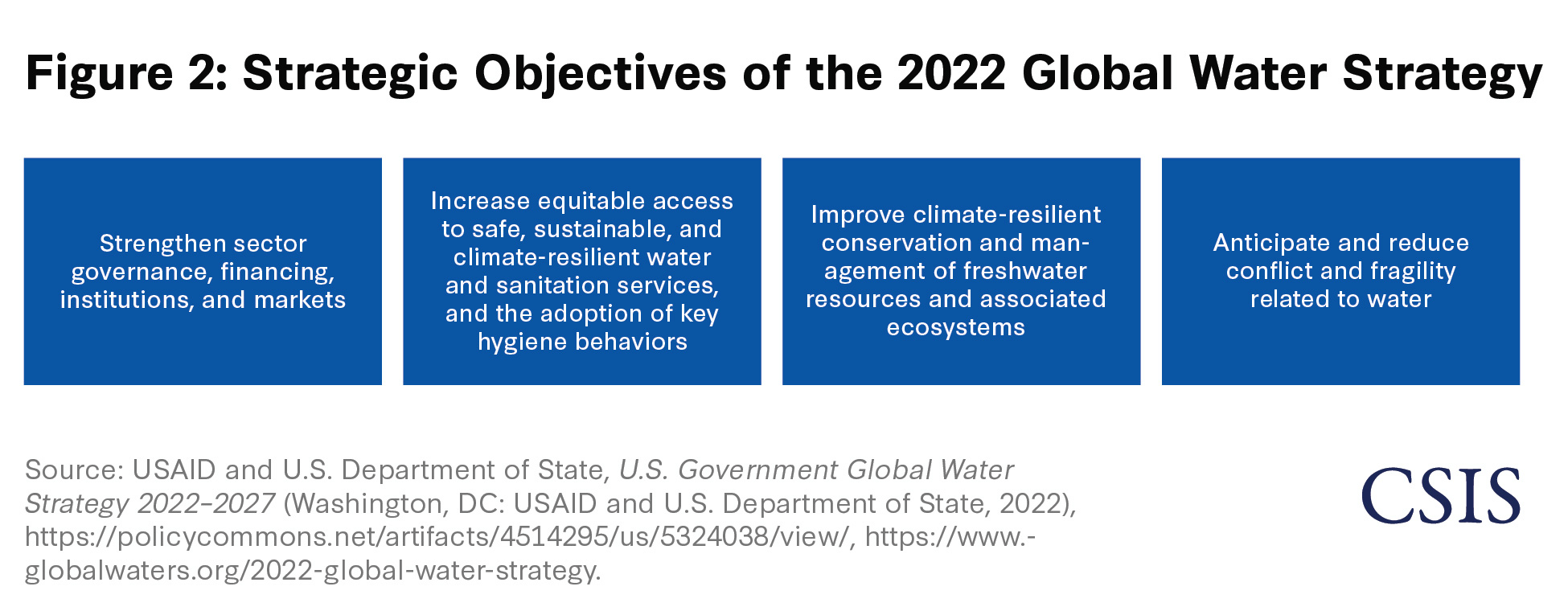 The Water for the World Act stipulates renewal of the Global Water Strategy on a five-year basis. In its second iteration, the U.S. Government Global Water Strategy 2022–2027 retains the four strategic objectives announced by the first, refining them to heighten the focus on climate resilience and conflict prevention. The current strategy defines these objectives as follows: strengthening sector governance, financing, institutions, and markets; increasing equitable access to safe, sustainable, and climate-resilient water and sanitation services and the adoption of key hygiene behaviors; improving climate-resilient conservation and management of freshwater resources and associated ecosystems; and anticipating and reducing conflict and fragility related to water. It also updates the set of “High-Priority” countries and adapts the selection criteria to include political and economic considerations of U.S. interests and program impact and sustainability. Expanding on the initial version, the strategy now targets 22 countries across Africa, Asia, and Central America, together with a further 15 “Strategic Priority” and “Expanded Global Portfolio” states.