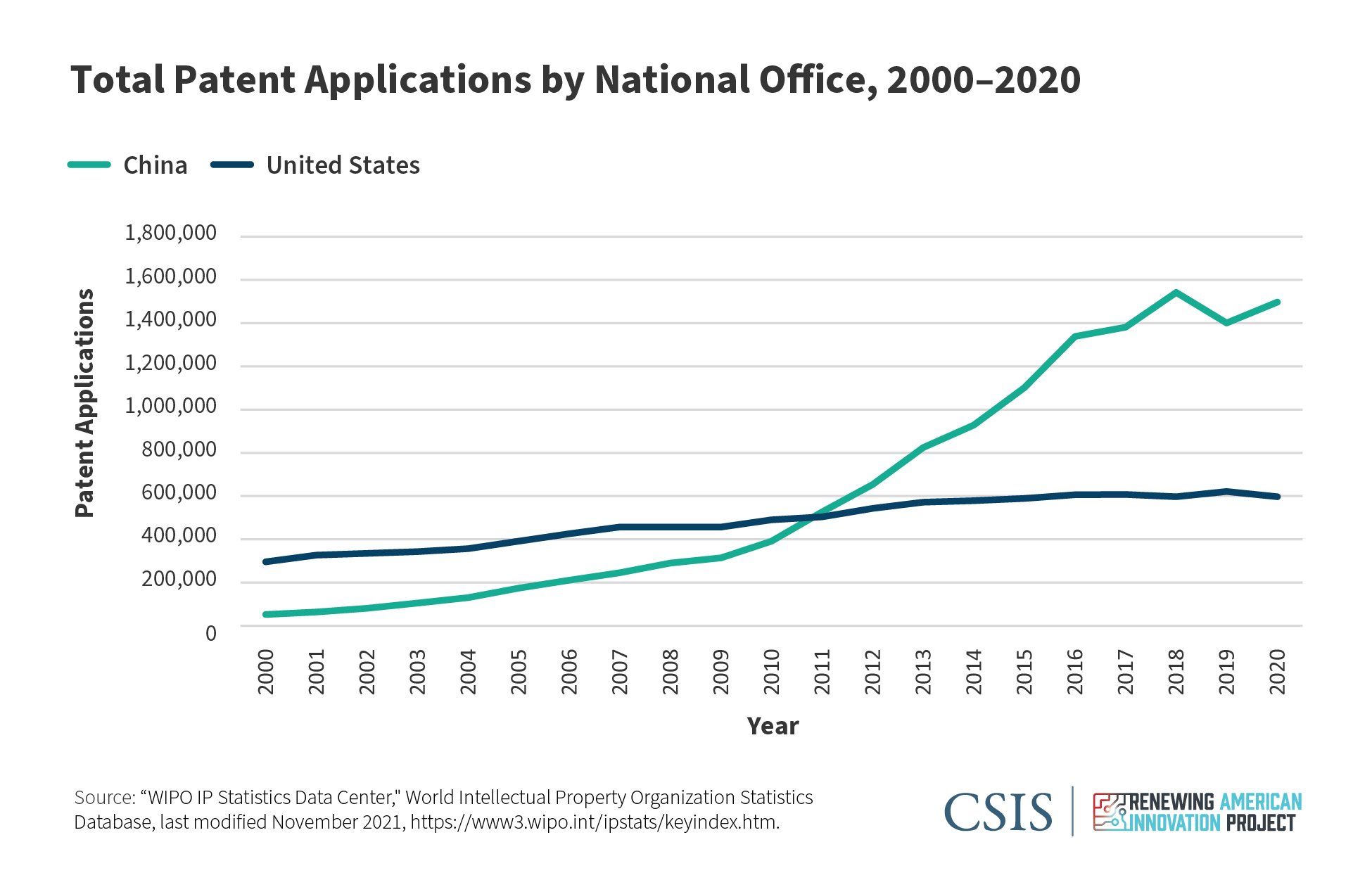 WIPO data show that Chinese filers dominate patent applications for inventions, utility models, or designs. In 2019, WIPO reported that China filed 1.4 million patents, or 43.4 percent of the world’s total patent applications that year. This was more than twice the level of applications in the United States.