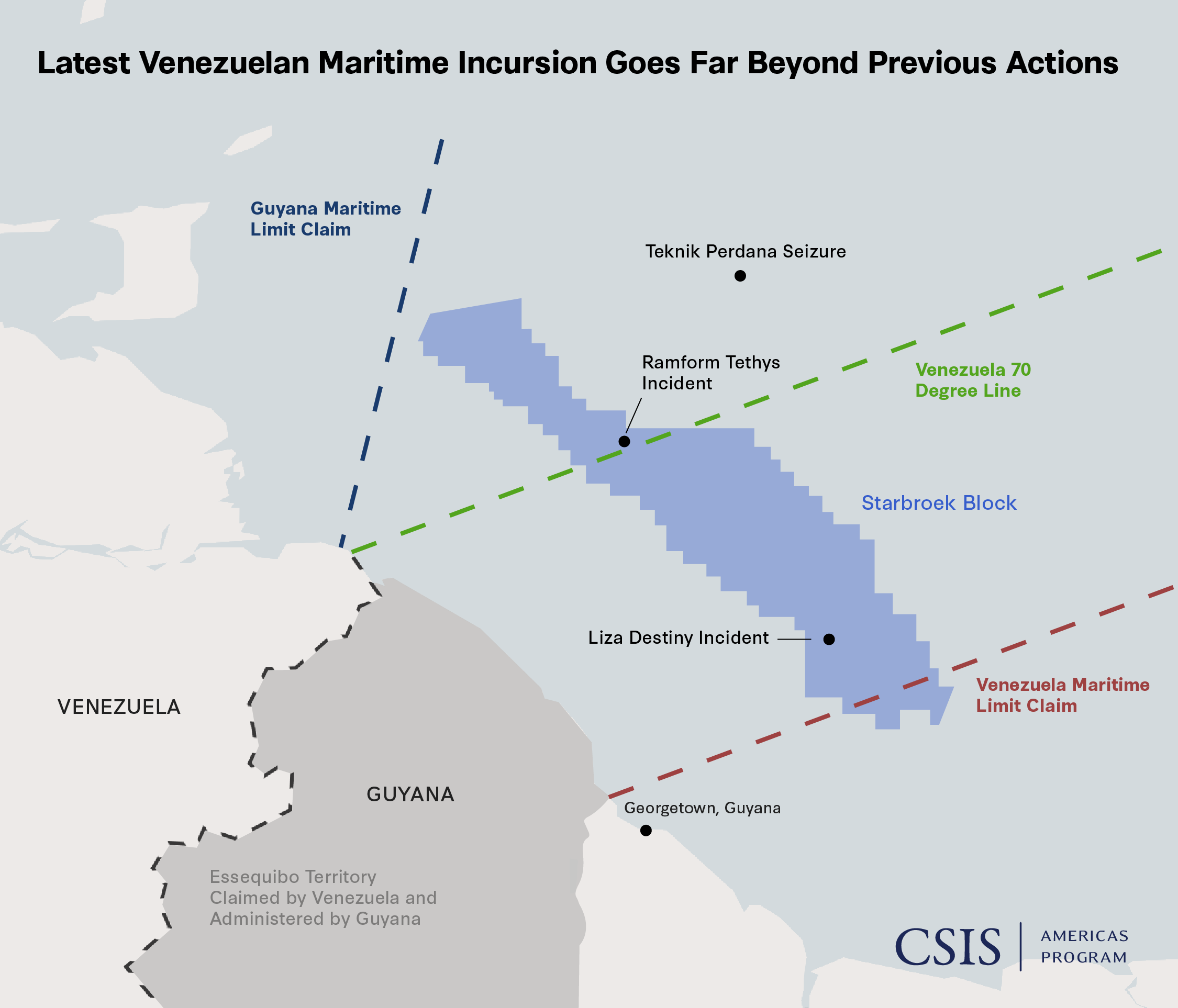 The incident that occurred on March 1, 2025, represents a significant escalation of Venezuela’s intimidation and harassment of Guyana’s oil exploration and extraction activities. The Liza Destiny floating production storage and offloading (FPSO) vessel was located approximately 200 kilometers southeast of the 70 degree line (projected from Punta Playa) when a Venezuelan navy warship sailed next to it and told the vessel it was in Venezuela’s EEZ. This location is in waters that are offshore of Georgetown, the country’s capital, a land area that is not remotely in dispute between the two countries. Later in the day, the Venezuelan warship broadcasted live-fire exercises on social media. The consortium led by Exxon operates three FPSO vessels in these waters, with a fourth ship, the FPSO One Guyana, about to come on-line. This will bring the consortium’s production to an average of 940,000 barrels per day (bpd) later in 2025, from an average of 616,000 bpd in 2024. This new capacity means Guyana would eclipse Venezuela’s oil production. The intended message from March 1 was very clear: Guyana’s oil operations are at the mercy of Venezuela’s armed forces.