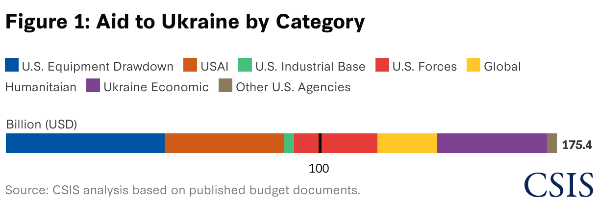 In past analyses, CSIS has divided aid to Ukraine into categories to illustrate the different purposes. Figure 1 shows how the $175 billion is laid out in seven categories. It’s all there, the $75 billion Zelensky cites and the “missing” $100 billion.