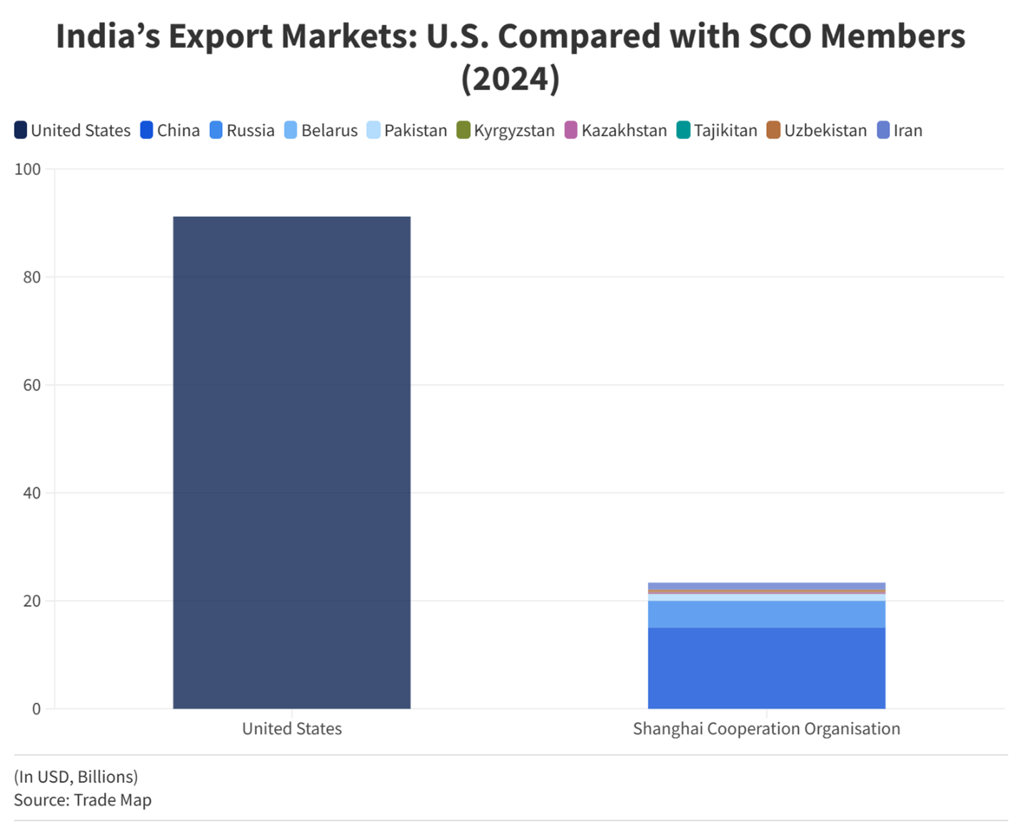 Accounting for 20.7 percent of India's global exports, the American export market is irreplaceable for India. New Delhi’s exports to the United States are six times higher than to China and nearly nineteen times higher than to Russia. Even when combining all Shanghai Cooperation Organization (SCO) countries — together representing $26.2 trillion in GDP and 23.5 percent of the global economy — they do not rival the United States as an export market for India. India’s 2024 exports to SCO members totaled $23.4 billion, barely a quarter of its exports to the U.S.