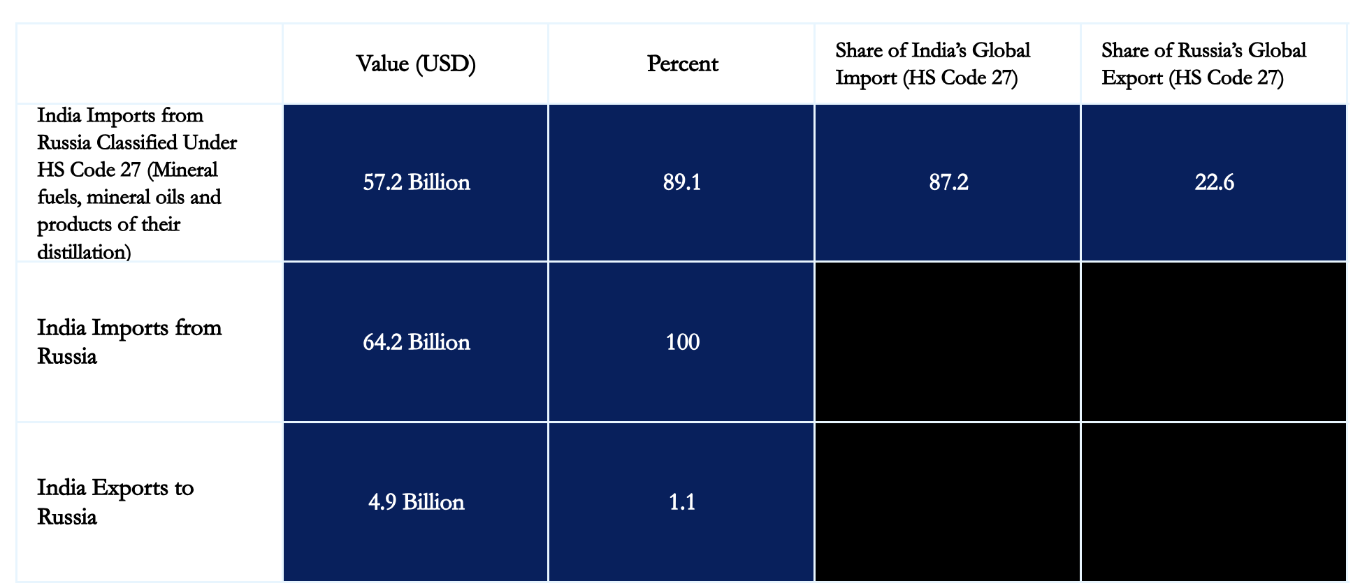 Even more pronounced is India's energy dependence on Russia. India has a $59.3 billion trade imbalance with Russia, with a lopsided import-export ratio of nearly 12:1. Russia’s exports to India are primarily goods classified under HS Code 27, including mineral fuels, mineral oils, and products of their distillation, accounting for 89.1 percent of India’s total imports from Russia.