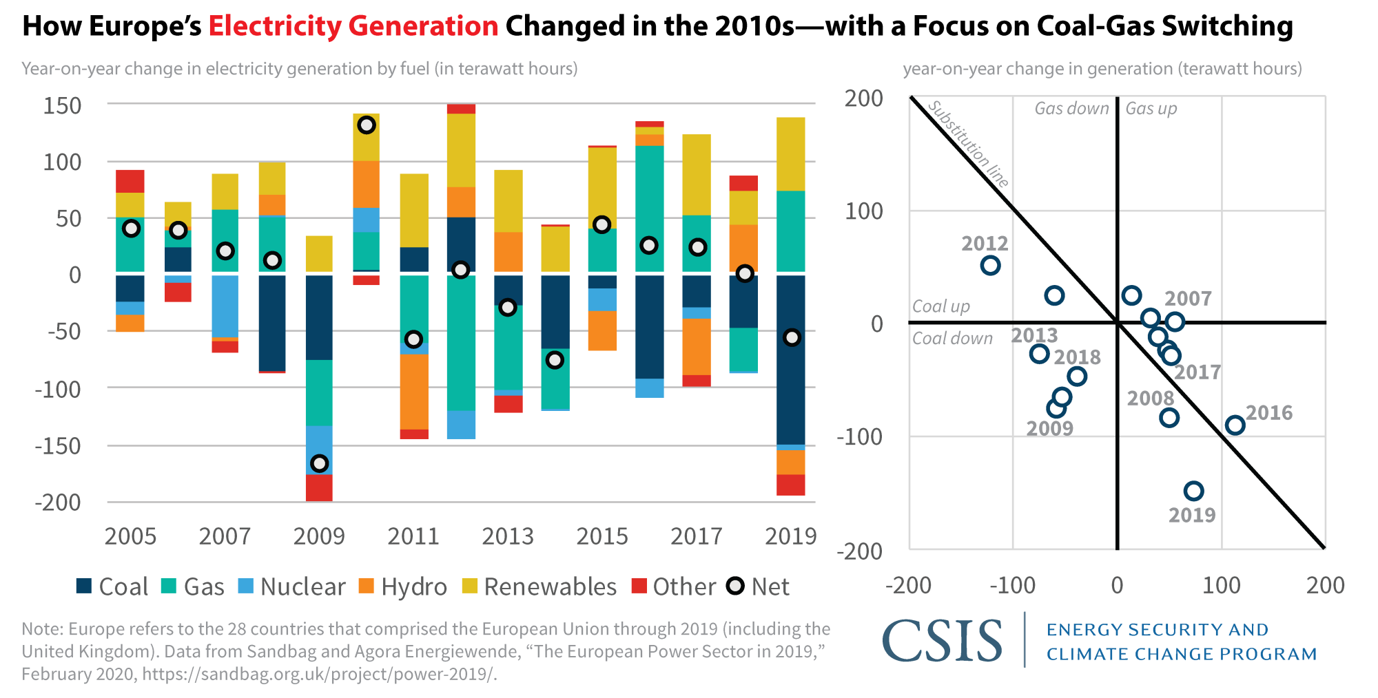 In 2019, coal-fired generation fell by almost 150 terawatt hours (TWh), while gas grew by 73.5 TWh—so roughly half the coal displacement came from gas (all data from this joint publication between Sandbag and Agora Energiewende). If one looks at a longer time period, from 2014 to 2019, the rise in gas (+242 TWh) covers almost three-fourths of the decline in coal (-330 TWh). But if one goes back further, to 2010, the picture is less clear. Coal has fallen 349 TWh from 2010 to 2019, while gas has also fallen by 65 TWh—in that time horizon, there is no observable switch from coal to gas.