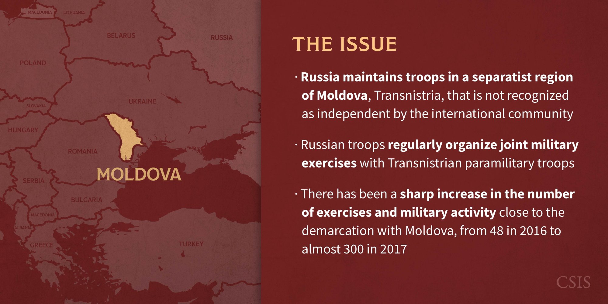 Russia has deployed “peacekeeping” troops in Transnistria since the 1992 ceasefire, totaling between 1,500 and 2,000 soldiers. The breakaway Transnistrian “military” is reported to have between 4,000 and 7,500 active troops, which are integrated into the Russian 14th Army (or Operative Group of the Russian Troops). Despite a 1999 commitment at the OSCE Istanbul Summit to withdraw these forces by 2002, Russia has maintained its military presence in the breakaway region and regularly organizes joint military exercises. The Kremlin also retains a large weapons depot in Cobasna, Transnistria.
