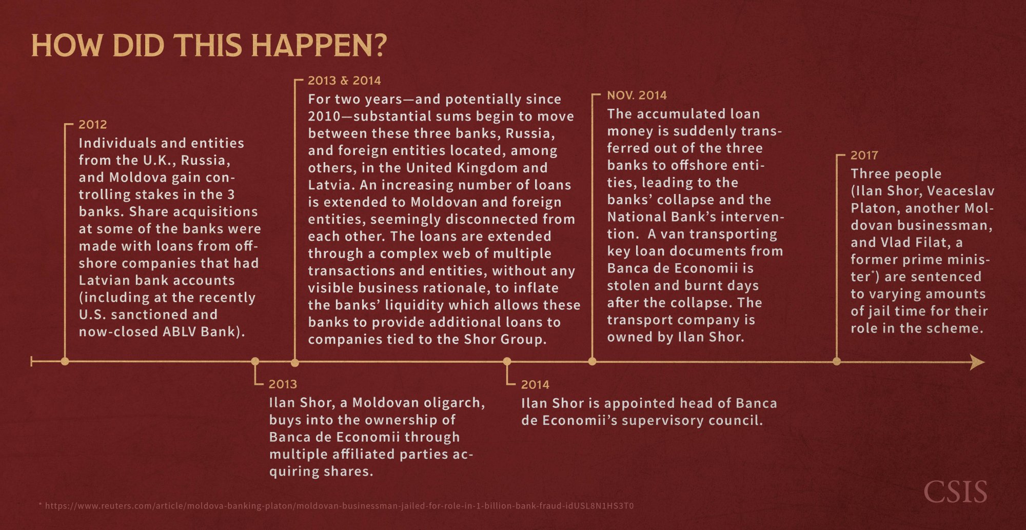 - Entities acquired stakes at three major Moldovan banks, then a complex system of loans and transactions between the banks and Russia, the United Kingdom, and Latvia artificially inflated the banks’ liquidity.