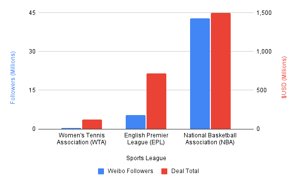 Gauging the relative popularity of different sports organizations is difficult due to scant data on Chinese viewership. Although not the same as the number of TV viewers, data from Weibo can help indicate an organization’s popularity in China. Given that the NBA has such a large number of followers (as shown in Figure 1), it is possible that the CCP could have wanted to provide a harsh punishment in order to dissuade Chinese citizens from speaking out in the same way. As one of the early cases, China may have also tried to inflict pain on the NBA to set an example and discourage others from following suit.