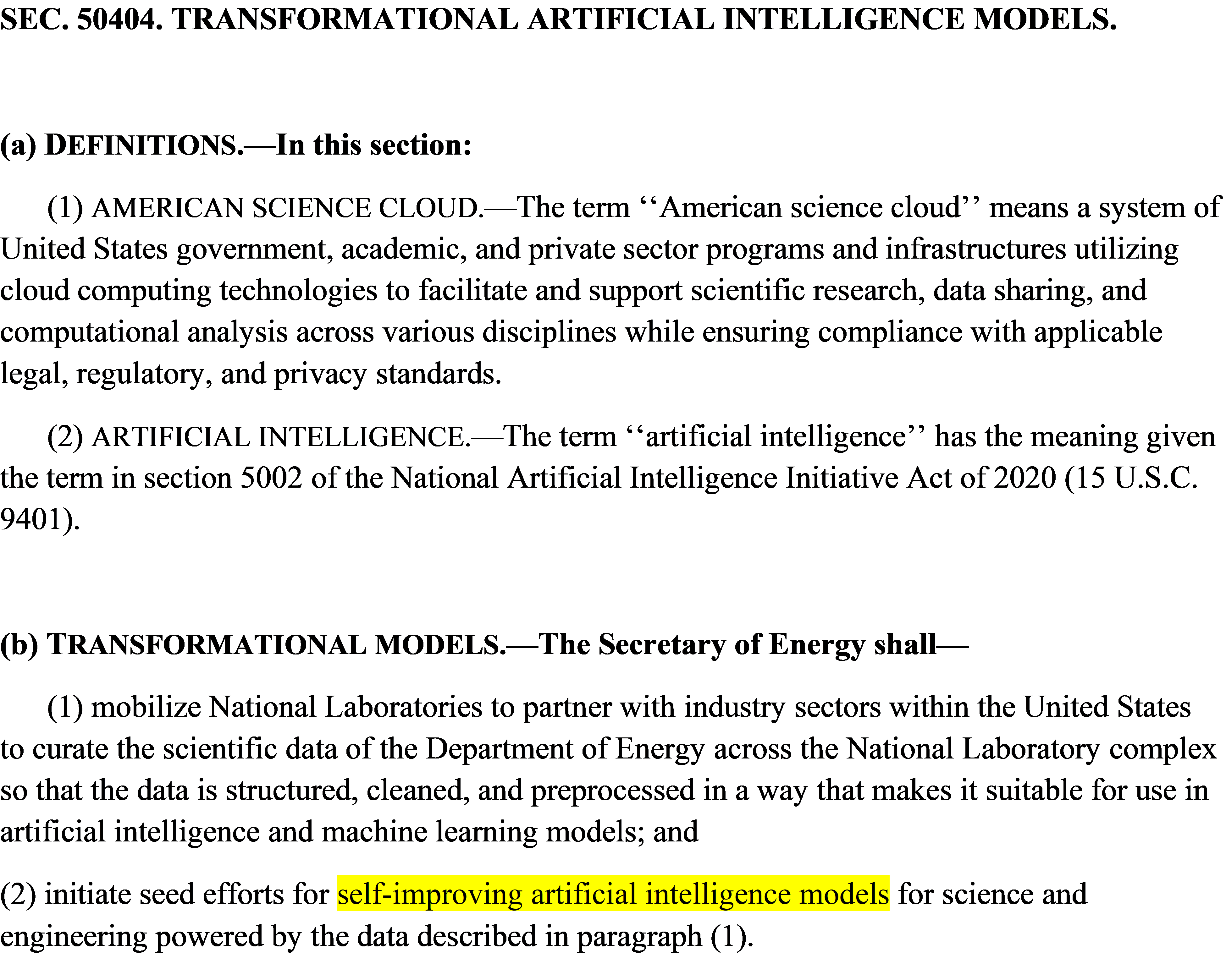 This recursive capability matters because today’s frontier models face bottlenecks in high-quality training data. Scaling laws show that performance improves with more compute and richer datasets, yet firms are hitting limits on what can be scraped from the internet or generated synthetically. Nobel laureate David Baker, reflecting on his breakthroughs in AI-driven protein design, credited much of his success to the exceptional quality of biology databases: “It's not just the methods, it's the data. And there aren't so many places where we have that kind of data.” National Labs are positioned to generate the kinds of advanced, domain-specific datasets Baker described in fields beyond biology. This is part of the logic behind Sec. 50404 of the One Big Beautiful Bill, which calls for “self-improving AI models,” in which novel discoveries made by labs trains models that then help design future experiments. Just as AI can support science, science can support AI.