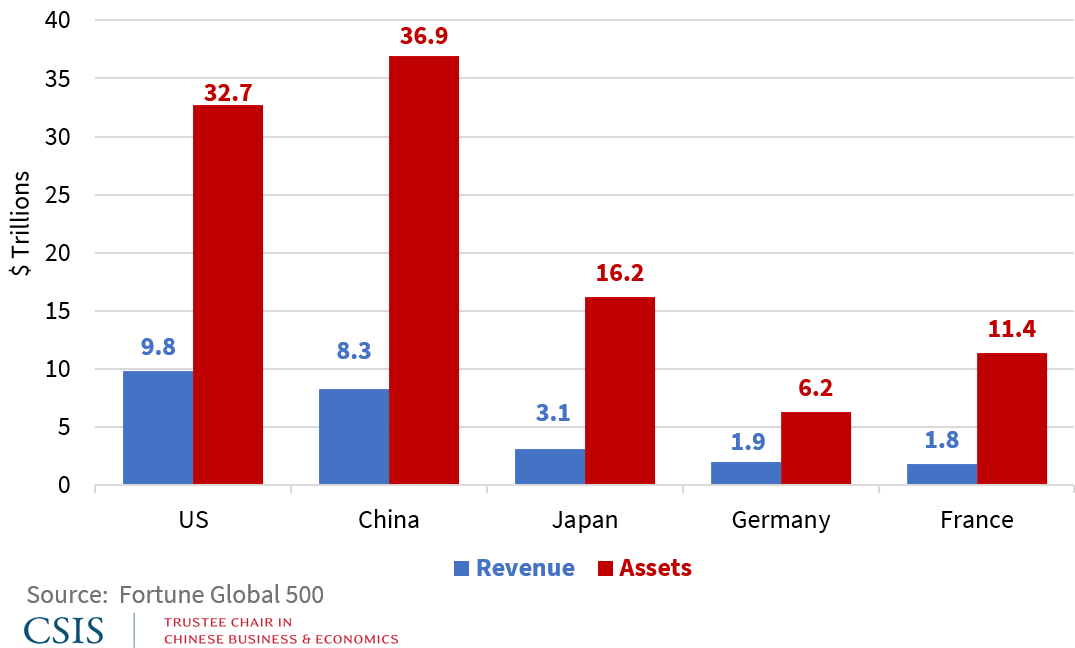Both American and Chinese firms also far outpace their counterparts in other size metrics, including revenue, profits, assets, and employees. But while Chinese entrants have surpassed American firms in terms of numbers and total assets, the US still is substantially in front of China when measured by annual revenue, $9.8 trillion to $8.3 trillion.