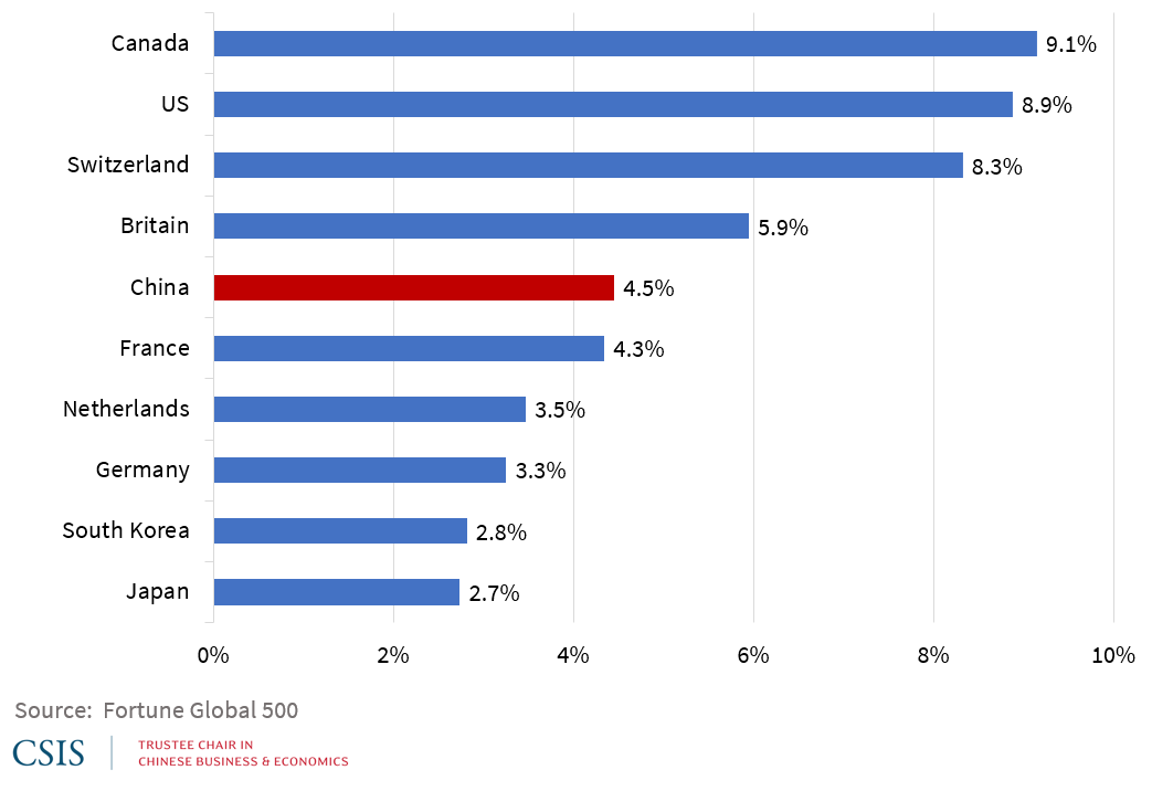 Despite their gargantuan size, or perhaps because of it, Chinese firms look less impressive when measured in terms of profitability. Their profit margin (profits/revenue) in 2020 was 4.5%, just slightly ahead of France (4.3%), but much lower than firms from Switzerland (8.3%), the US (8.9%) and Canada (9.1%). The story is even worse for return on assets (ROA). China’s 124 listed companies averaged an ROA of 1.9%, still just ahead of France (1.7%), but once again substantially behind Switzerland (4.2%) and the US, which led at 4.9%.