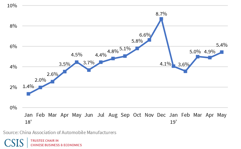 However, those numbers can be deceiving. China’s automobile industry has slowed down significantly over the last two years. In 2019, the slowdown finally hit the NEV segment. NEV sales in May 2019 were only 2.0% higher than the year before, a drastic drop in the growth of sales (see Figure 2). If China persists in reducing subsidies for NEVs, sales should continue to lag in the second half of 2019 and the overcapacity that exists in traditional cars will be more visible in NEVs as well.