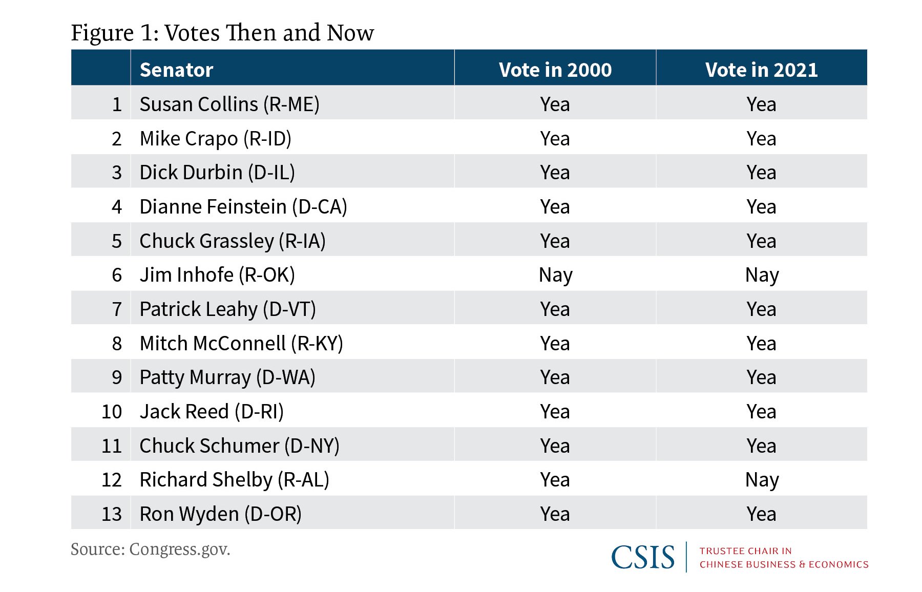 This entirely understandable reorientation comes through loud and clear in a comparison of the Senate’s votes. Thirteen senators who cast a vote on June 8, 2021, also cast a vote on the PNTR on September 19, 2000. As Figure 1 shows, 11 of them voted “yea” both times, granting PNTR and then supporting building the United States’ tools to compete against China. The two exceptions are consistent with the broader change, as Senators Inhofe and Shelby voted “nay” because the final package left out their amendment requiring that defense spending rise as much as non-defense discretionary spending.