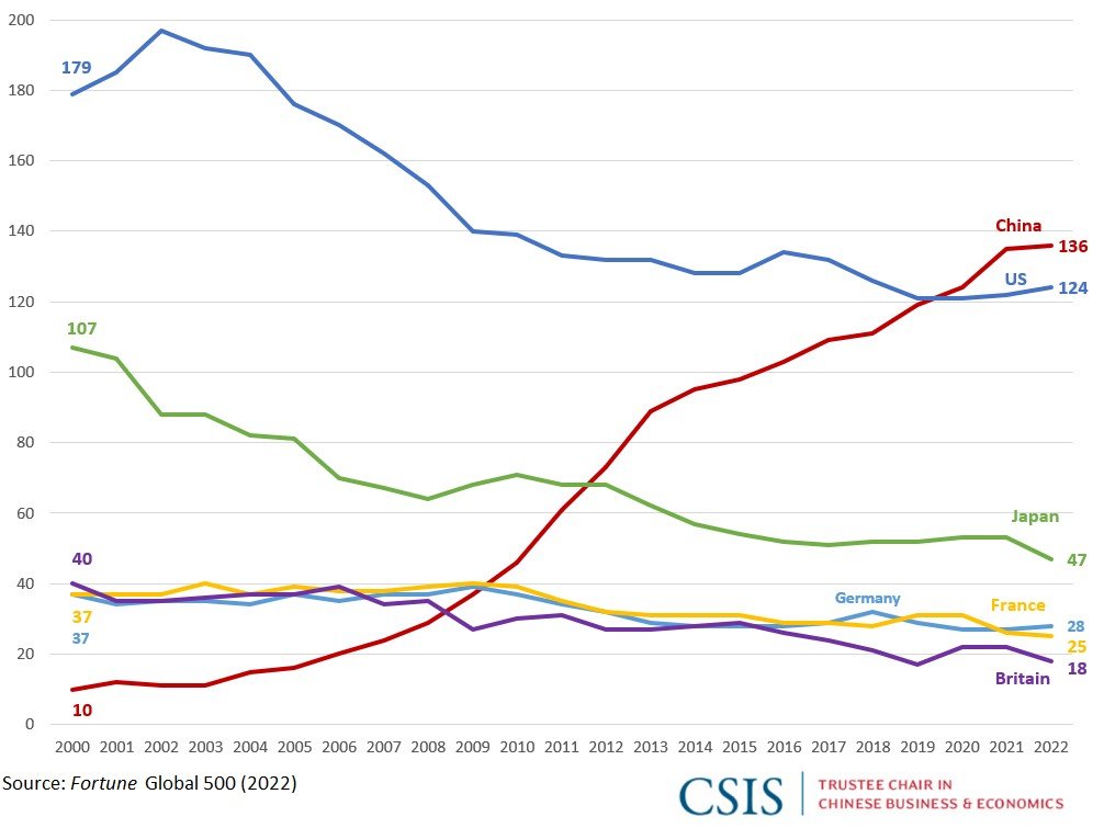 Chinese firms continue to outnumber those from the United States, 136 to 124, and are way ahead of Japan, which has only 47 companies on the list. China now has more firms on the list than Japan, Germany, France, and United Kingdom combined (Figure 1).
