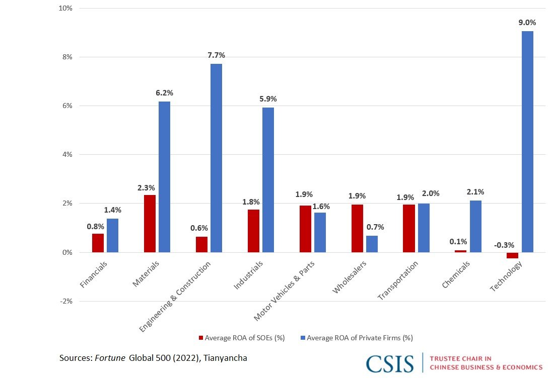 Side-by-side comparisons of Chinese SOEs and private firms in the Global Fortune 500 show that out of the nine sectors that have both private firms and SOEs who made it on the list, private firms outperformed SOEs in seven of them (Figure 7).
