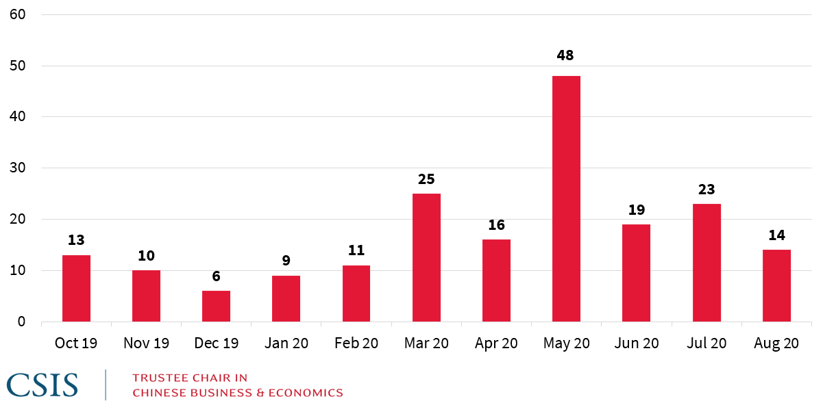Another big takeaway is the increase in the tempo of legislation. There has been a huge wave of China-related bills introduced over the past six months, beginning with an initial jump in March and then followed by a huge spike in May. As one would expect, much of this activity is in response to the pandemic, including holding China accountable for the outbreak, addressing supply chain vulnerabilities and expanding domestic manufacturing capacity. But few issues have been left untouched. The steep rise in introduced legislation reflects the rising salience of China in many aspects of American foreign policy and domestic life, and with it, the political importance for members of Congress to get involved in China policy.