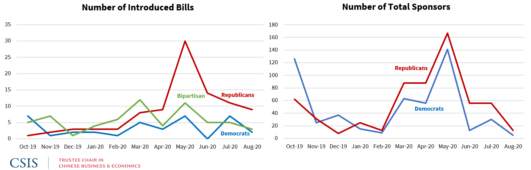 On the other hand, attention to China has risen significantly by members of both parties in both houses. If measured by the number of sponsors and co-sponsors (right-hand side of Figure 3), Democrats outnumbered Republicans in the last quarter of 2019. During 2020, Republicans have held an edge in total number of sponsors and co-sponsors, but the trend lines are remarkably similar.