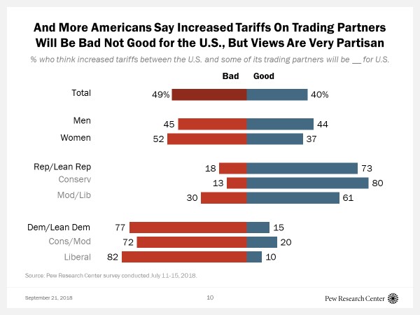 A Pew poll taken at about the same time shows even more extreme results—overwhelming Republican belief that increased tariffs will be good for the United States and equally overwhelming Democratic belief that they will be bad.