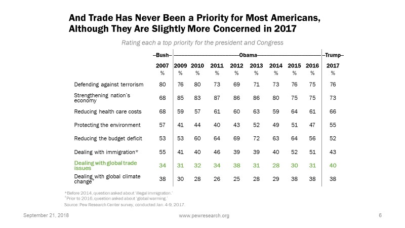 Normally that doesn’t matter much because trade has been what pollsters would call a low-intensity issue. People have opinions about it, but that does not mean they translate their opinions into votes. Pew annually asks people what are the biggest challenges the country face, and trade (along with climate change, sadly) regularly rank at the bottom.