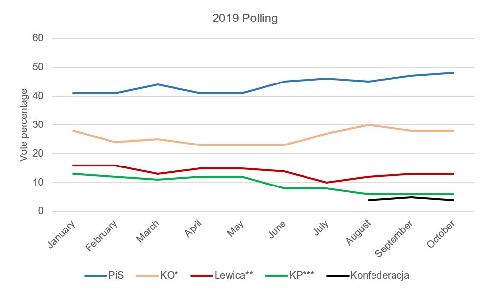 - Despite growing anger and frustration regarding PiS’s challenge to democratic institutions and norms, Polish opposition parties have been unable to rally under a common umbrella in the last few months. Their alliance in the European Parliament elections in May, in which observers thought the opposition would do well, did not yield strong results. PiS has dominated online campaigning over all other parties. Automated bots have at times spread misinformation and conspiracy theories. Thanks to its popular government spending programs and political domination (including of the airwaves), PiS will likely increase its majority in this election.